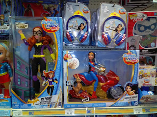 The doll I bought is one of the Mattel WWE wrestlers, Becky Lynch. I didn't see any Sasha Banks with the extra green dress and black pump shoes. This store had a few of the 6-doll set, but a.) I don't know that I want all of those dolls, and b.) I prefer the outfits on the single or the extra fashion dolls. Becky wears a pair of steampunk-themed leggings that I like - for her (not ever for me, lol). Her top is meh, matching the leggings but not striking. I like the black ankle boots. I don't imagine Wonder Woman borrowing the outfit, but she might borrow the boots. Maybe. Here's the Mattel box photo of this doll followed by the photo of my doll.